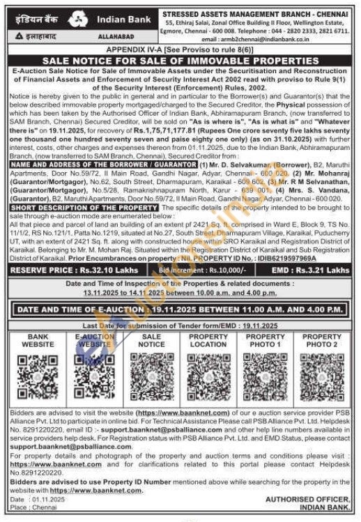 The specific details of the property intended to be brought to sale through e-auction mode are enumerated below: All that piece and parcel of land an building of an extent pf 2421 Sq. ft. comprised in Ward E. Block 9, TS No. 11/1/2, RS No. 121/1, Patta No. 1219, situated at No 27, South Street, Dharmapuram Village, Karaikal, Puducherry UT, with an extent of 2421 Sq. ft. along with constructed house within SRO Karaikal and Registration District of Karaikal. Belonging to Mr. M. Mohan Raj. Situated within the Registration District of Karaikal and Sub Registration District of Karaikal. Prior Encumbrances on property: Nil. PROPERTY ID No.: IDIB6219597969A