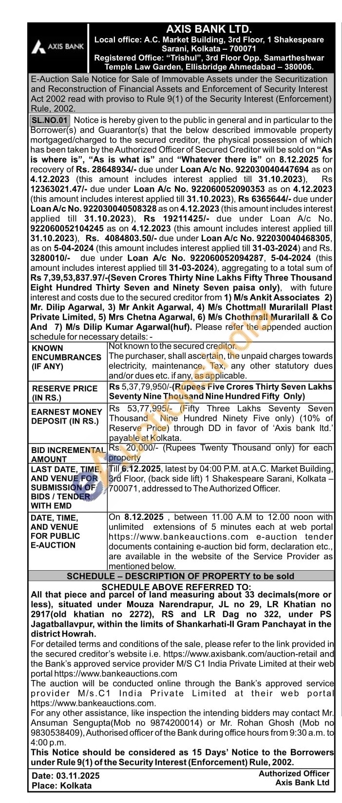 All that piece and parcel of land measuring about 33 decimals(more or less), situated under Mouza Narendrapur, JL no 29, LR Khatian no 2917(old khatian no 2272), RS and LR Dag no 322, under PS Jagatballavpur, within the limits of Shankarhati-II Gram Panchayat in the district Howrah