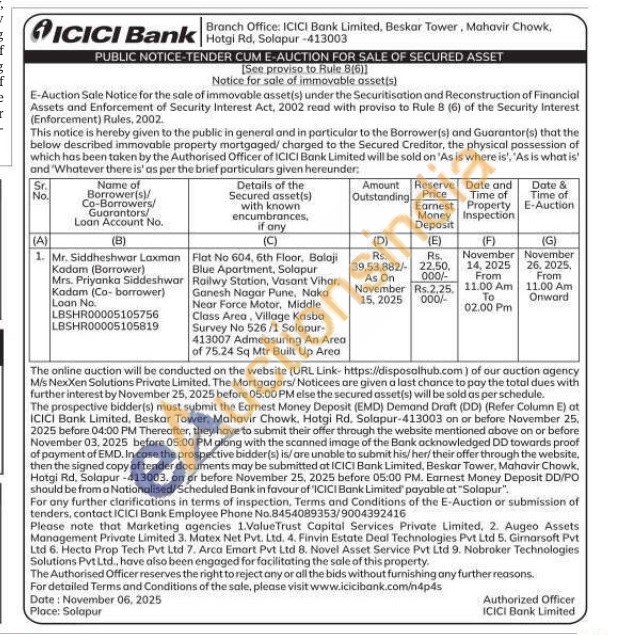 Flat No 604, 6th Floor, Balaji Blue Apartment, Solapur Railwy Station, Vasant Vihar. Ganesh Nagar Pune, Naka Near Force Motor, Middle Class Area, Village Kasba Survey No 526/1 Solapur-413007 Admeasuring An Area of 75.24 Sq Mtr Built Up Area
