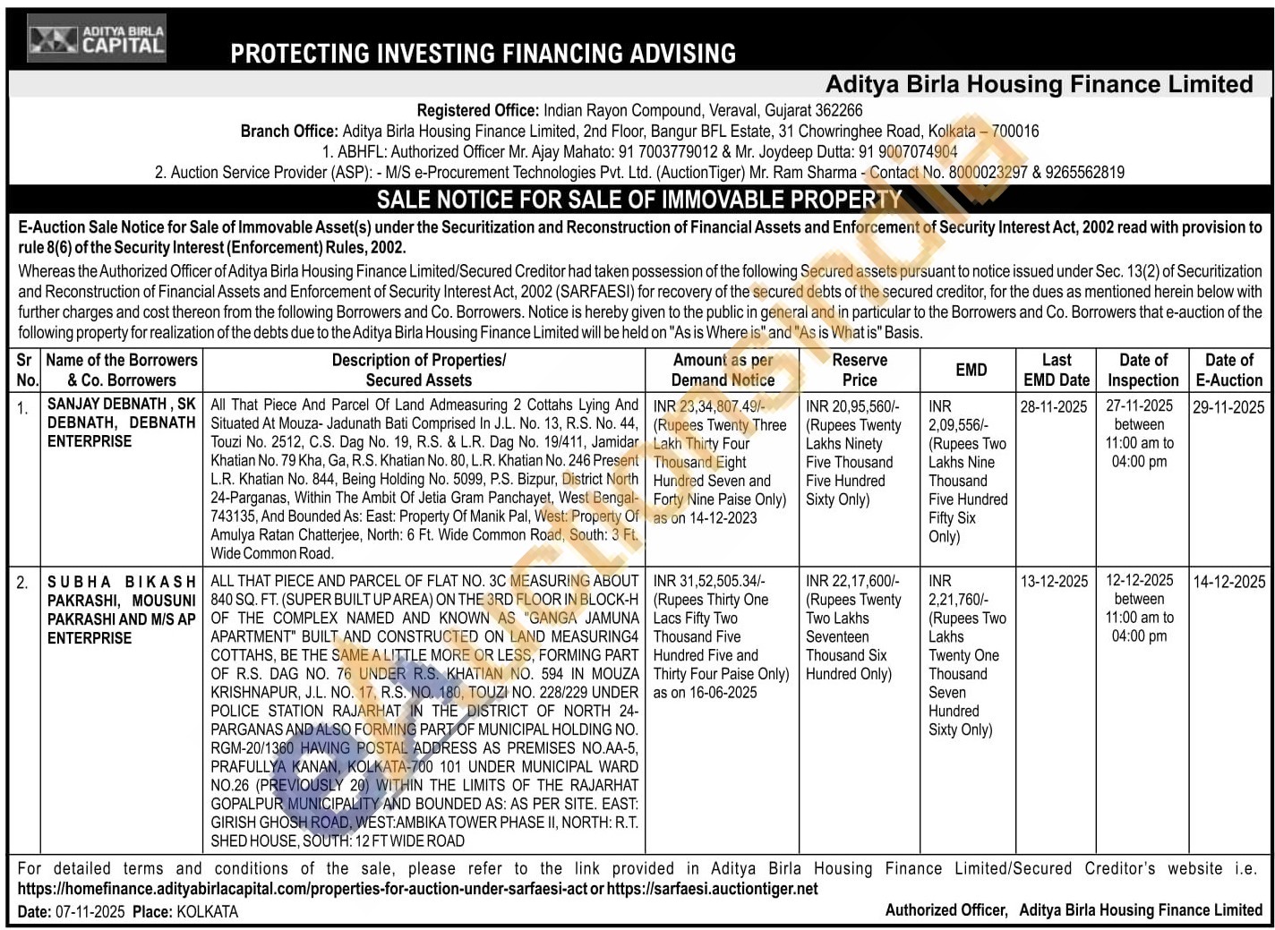 Contact : ABHFL: Authorized Officer Mr. Ajay Mahato: 91 7003779012 / Mr. Joydeep Dutta: 91 9007074904