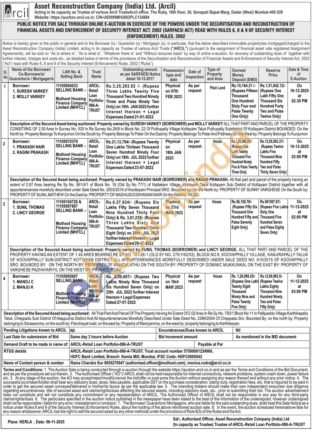 Description of the Secured Asset being auctioned: Property owned by SURESH VARKEY (BORROWER) and MOLLY VARKEY ALL THAT PART AND PARCEL OF THE PROPERTY CONSITIING OF 2.00 Ares In Survey No. 525 In Re Survey No.26/9 In Block No. 22 Of Puthupally Village Kottayam Taluk Puthupally Subdistrict Of Kottayam District. BOUNDED: On the North by: Property Belongs To Kunjumon On the South by: Property Belongs To Peter On the East by: Property Belongs To Peter And Pathway On the West by: Property Belongs To Kunjumon