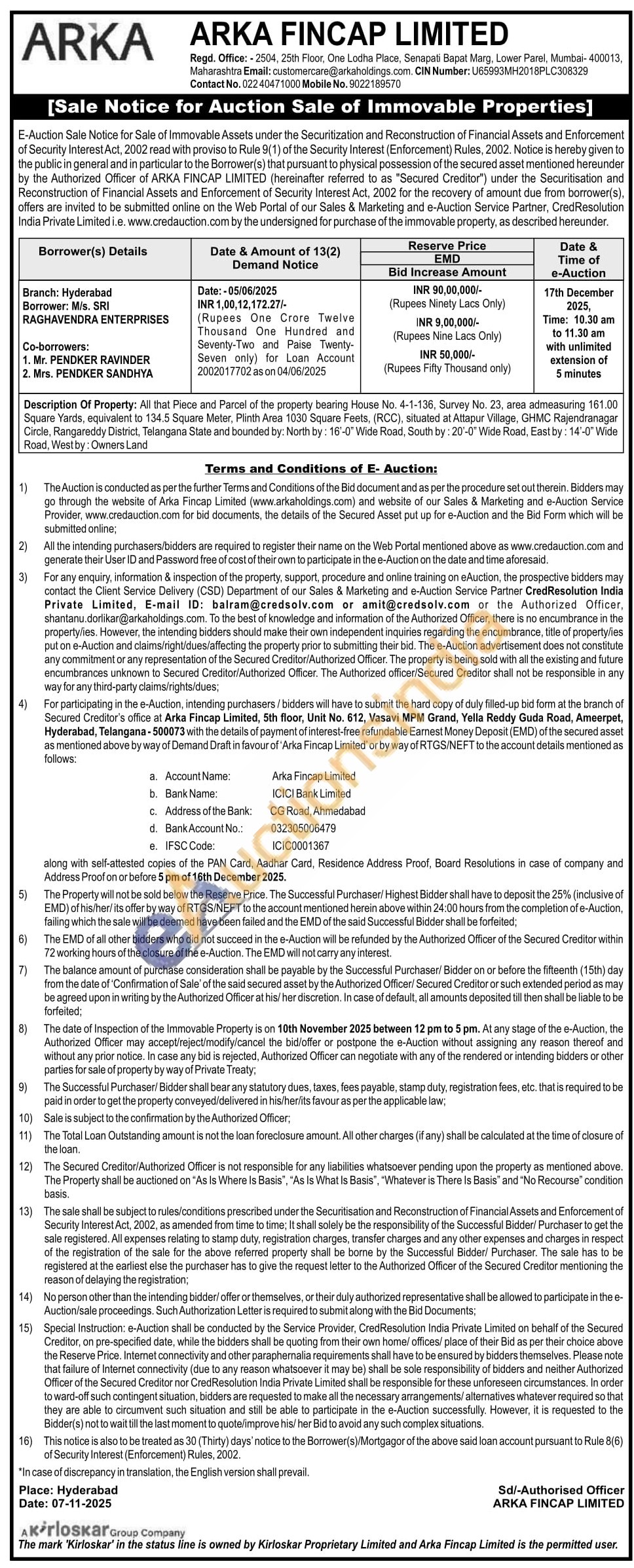 Description Of Property: All that Piece and Parcel of the property bearing House No. 4-1-136, Survey No. 23, area admeasuring 161.00 Square Yards, equivalent to 134.5 Square Meter, Plinth Area 1030 Square Feets, (RCC), situated at Attapur Village, GHMC Rajendranagar Circle, Rangareddy District, Telangana State and bounded by: North by: 16'-0" Wide Road, South by: 20'-0" Wide Road, East by: 14'-0" Wide Road, West by: Owners Land