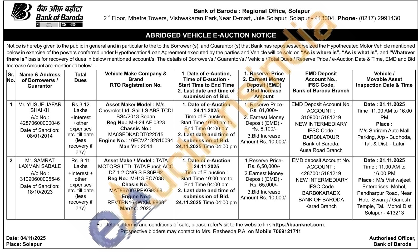 Asset Make/Model: TAΤΑ MOTORS LTD, TATA Punch ACC DZ 1.2 CNG S BS6PH2 Reg No.: MH13 EC7038 Chasis No.: MAT867007PPKG9369 Engine No.: REVTRN16KWXMJ9868 ManYr: 2023