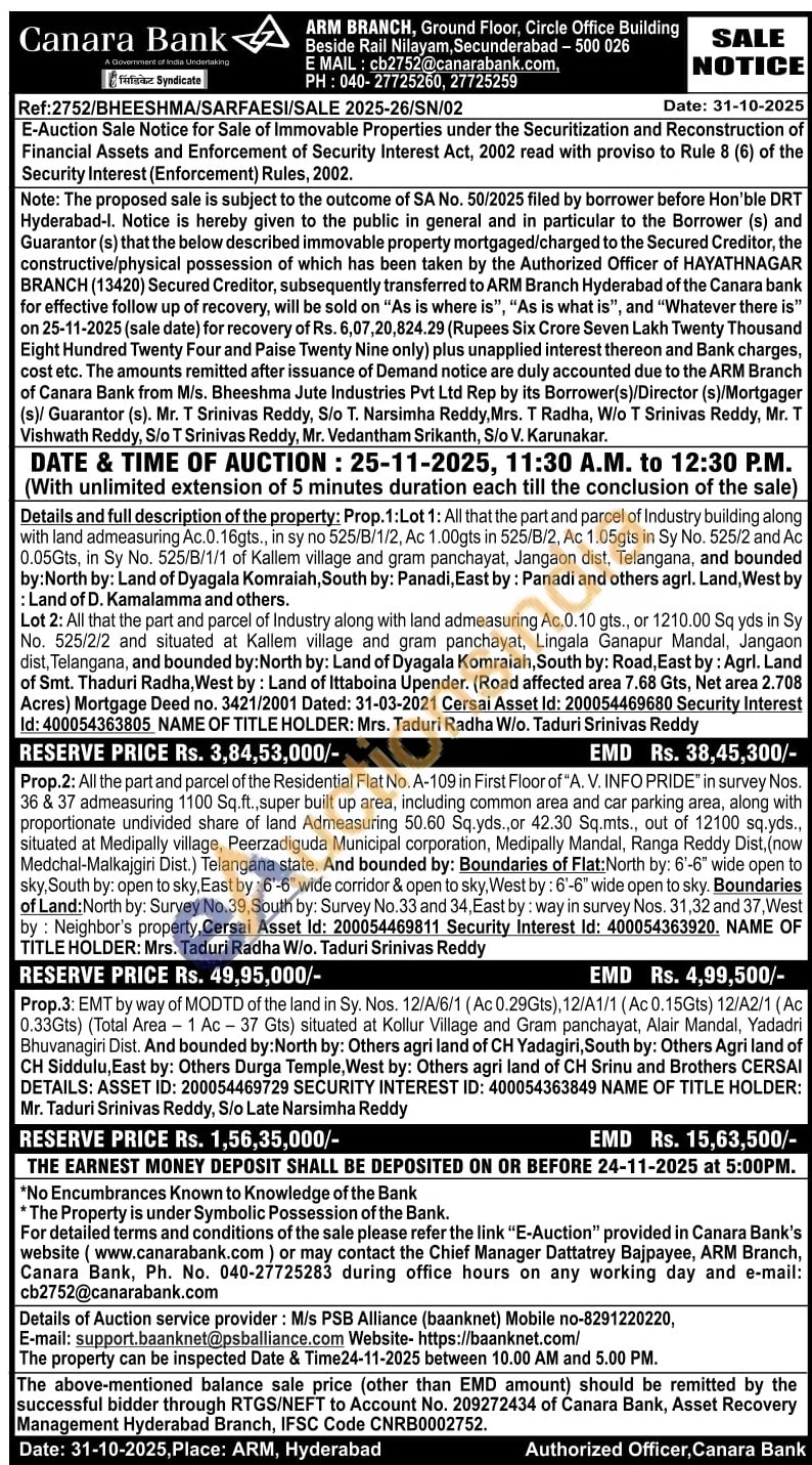 Details and full description of the property: Prop.2: All the part and parcel of the Residential Flat No. A-109 in First Floor of "A. V. INFO PRIDE" in survey Nos. 36 & 37 admeasuring 1100 Sq.ft., super built up area, including common area and car parking area, along with proportionate undivided share of land Admeasuring 50.60 Sq.yds., or 42.30 Sq.mts., out of 12100 sq.yds., situated at Medipally village, Peerzadiguda Municipal corporation, Medipally Mandal, Ranga Reddy Dist, (now Medchal-Malkajgiri Dist.) Telangana state. And bounded by: Boundaries of Flat:North by: 6-6" wide open to sky, South by: open to sky, East by: 6'-6" wide corridor & open to sky, West by: 6'-6" wide open to sky. Boundaries of Land: North by: Survey No.39, South by: Survey No.33 and 34, East by: way in survey Nos. 31,32 and 37, West by: Neighbor's property, Cersai Asset Id: 200054469811 Security Interest Id: 400054363920. NAME OF TITLE HOLDER: Mrs. Taduri Radha W/o. Taduri Srinivas Reddy