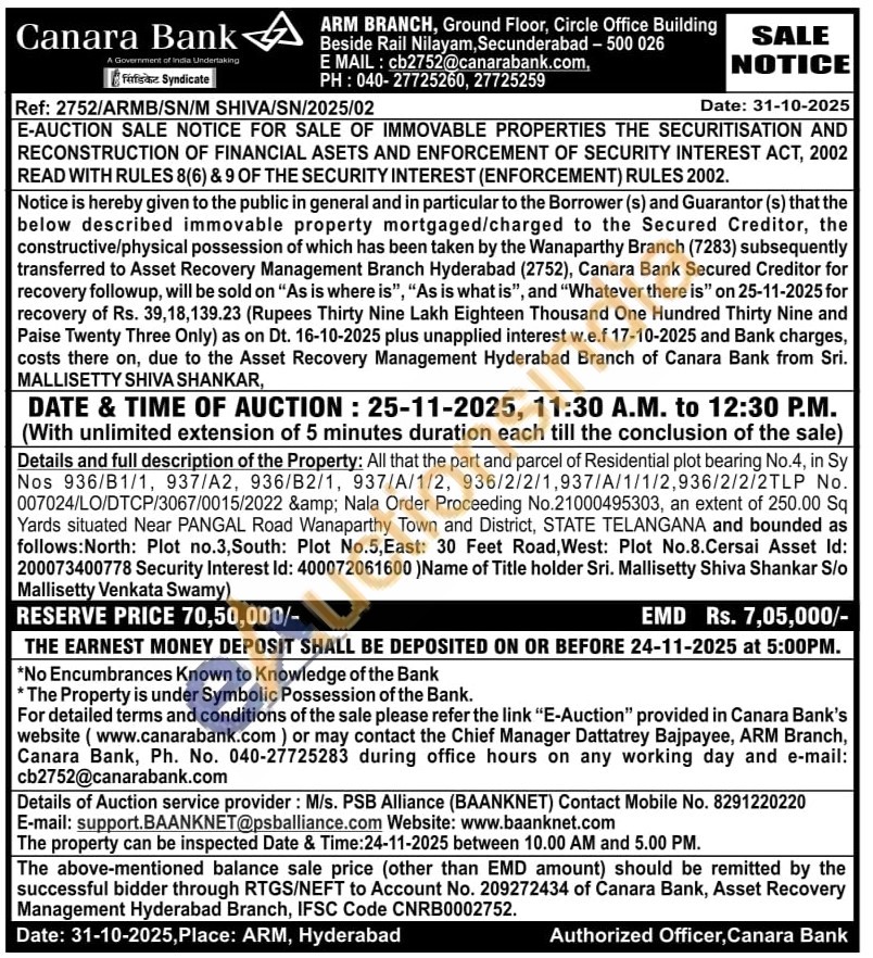 Details and full description of the Property: All that the part and parcel of Residential plot bearing No.4, in Sy Nos 936/B1/1, 937/A2, 936/B2/1, 937/A/1/2, 936/2/2/1,937/A/1/1/2,936/2/2/2TLP No. 007024/LO/DTCP/3067/0015/2022 & Nala Order Proceeding No.21000495303, an extent of 250.00 Sq Yards situated Near PANGAL Road Wanaparthy Town and District, STATE TELANGANA and bounded as follows: North: Plot no.3, South: Plot No.5, East: 30 Feet Road, West: Plot No.8.Cersai Asset Id: 200073400778 Security Interest Id: 400072061600) Name of Title holder Sri. Mallisetty Shiva Shankar S/o Mallisetty Venkata Swamy)