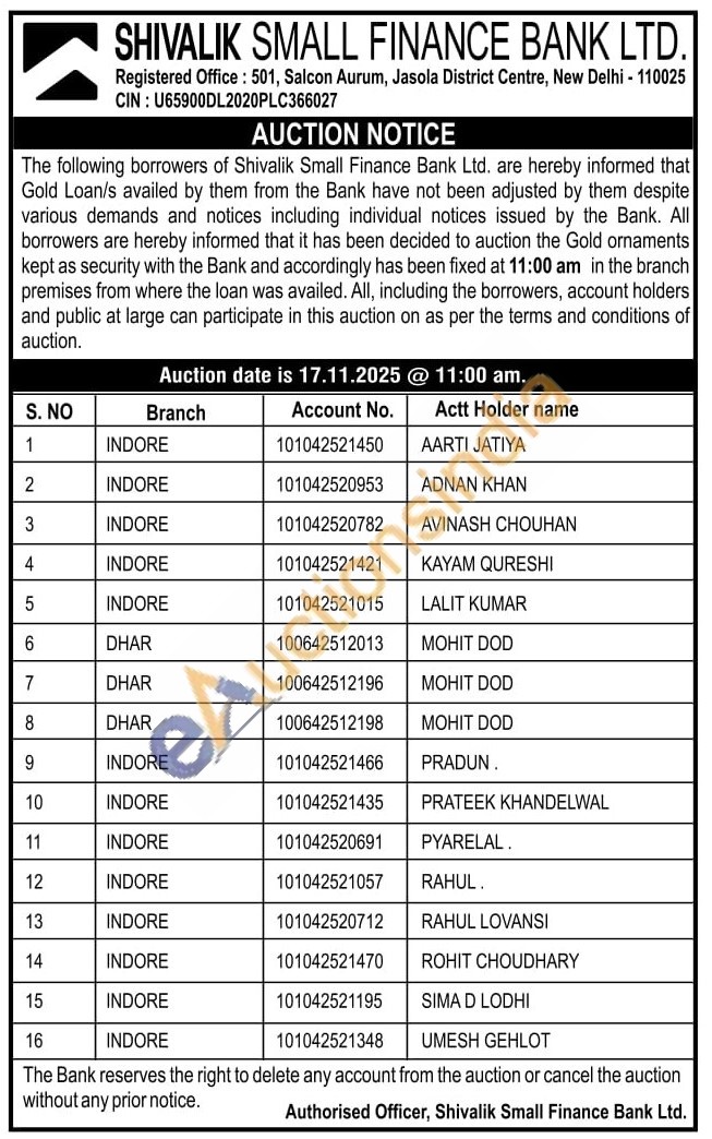 Shivalik Small Finance Bank Ltd Gold Auctions Auction in Indore