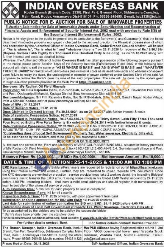 All the part and parcel of the Plant and Machinery of VERTICAL PULVERISING MILL, situated in factory premises of M/s Radiant Oil Field Minerals situated at S.No. 451/2,452/1,2,3,453,454/2,3,4, Govindampalli village and Post, Obullavaripalli Mandal, Kadapa District (Now Annamayya District)-516105
