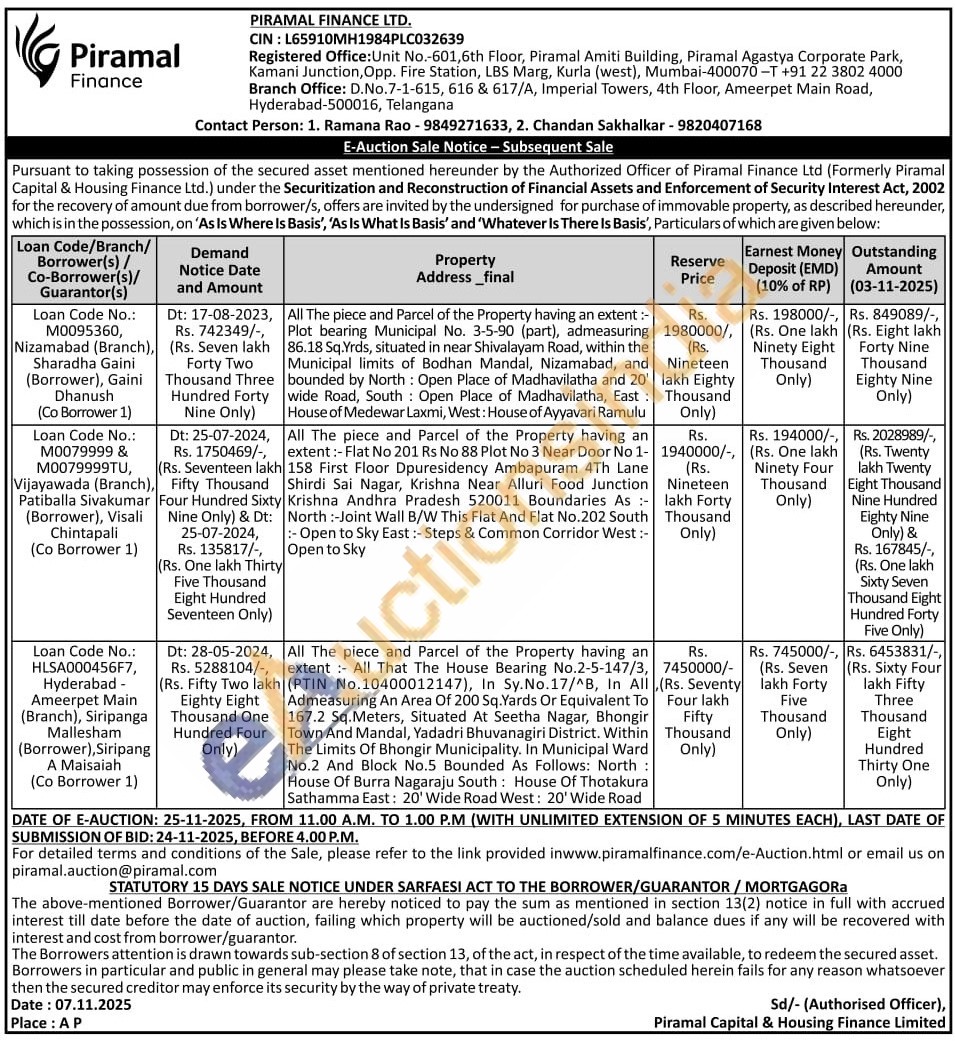 All The piece and Parcel of the Property having an extent: All That The House Bearing No.2-5-147/3, (PTIN No.10400012147), In Sy.No.17/^B, In All Admeasuring An Area Of 200 Sq. Yards Or Equivalent To 167.2 Sq.Meters, Situated At Seetha Nagar, Bhongir Town And Mandal, Yadadri Bhuvanagiri District. Within The Limits Of Bhongir Municipality. In Municipal Ward No.2 And Block No.5 Bounded As Follows: North: House Of Burra Nagaraju South: House Of Thotakura Sathamma East: 20' Wide Road West: 20' Wide Road