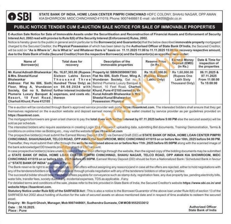 Property Id: SBIN39590067393 Flat No 606, Sixth Floor, Wing A, Vrundavan Society, Gat no 9, Behind Plumeria Luxury Banquet & Resort, 10 Feet Road, Charholi Khurd, Pune 412105 owned by Mr. Kunal Adinath Bhalwankar & Mrs. Sheetal Kunal Bhalwankar. Possession: Physical