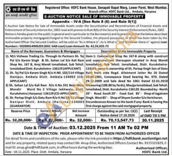 Item-1: Commercial Shop No 167-B along with construct and superstructure thereupon situated in Anaj Mandi Ismailabad, Sub Tehsil. Ismailabad, Distt. Kurukshetra-133103, came in ownership of Sh. Partap Singh Son of Datu Ram from vide Regd. Allotment latter No 26 Dated CO-10.04.2001, Conveyance Deed bearing No. 970, Dated 29.12.2009 and Sale deed No 1061 Dated 22.01.2010 Measuring (188.88 Sq Yards), Maujja Ismailabad, Sub Tehsil. Ismailabad, Distt. Kurukshetra-136129. Bounded by:-North 20 Road. South 20 Faad. East 85 Shop of Jagatram Singh. West 85 Shop of Shyam Sunder S/o Haricharan. Encumbrances Known to the bank if any: Bank is having the first charge against the said mortgaged property.
