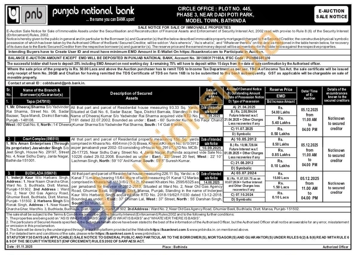 All that part and parcel of Residential house measuring 93.33 Sq. Yards, Situated at Gali No. 6, Sadar Bazar, Tapa, District Barnala, Standing in the , Name of Dheeraj Kumar S/o Yadwinder Rai Sharma acquired vide RTD No. 1161 dated 22.07.2002. Bounded as under: East: 60' Surinder Kumar S/o Faqir Chand West: 60' Gali No. 6, North: 14 Dheeraj Kumar Sharma Sio Yadwinder Rai Sharma, South: 14' Gali 6' wide