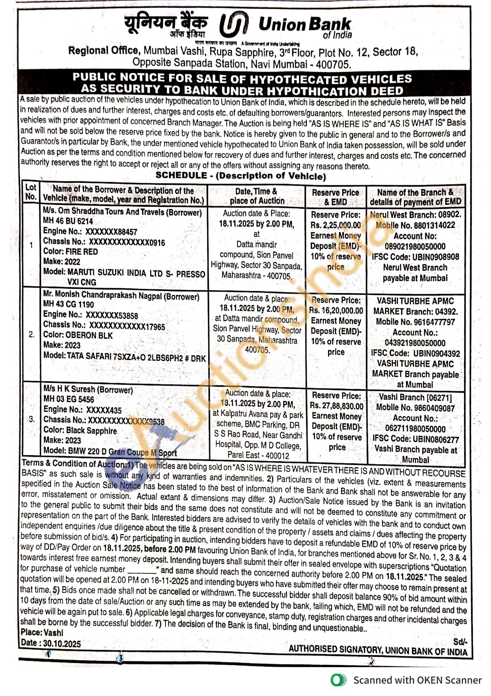 MH 46 BU 6214 Engine No.: XXXXXXX88457 Chassis No.: XXXXXXXXXXXXX0916 Color: FIRE RED Make: 2022 Model: MARUTI SUZUKI INDIA LTD S- PRESSO VXI CNG