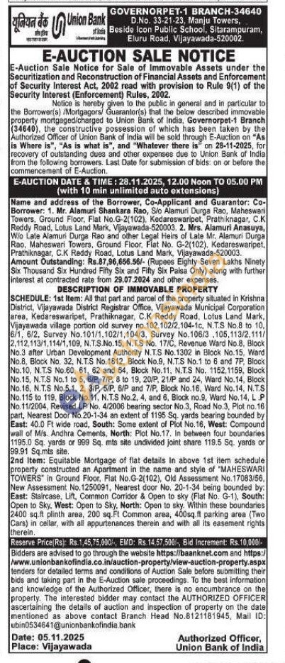 2nd Item: Equitable Mortgage of flat details in above 1st item schedule property constructed an Apartment in the name and style of "MAHESWARI TOWERS in Ground Floor, Flat No.G-2(102), Old Assessment No.17083/56, New Assessment No. 1250091, Nearest door No. 20-1-34 being bounded by: East: Staircase, Lift, Common Corridor & Open to sky (Flat No. G-1), South: Open to Sky, West: Open to Sky, North: Open to sky. Within these boundaries 2400 sq.ft plinth area, 200 sq.Ft Common area, 400sq.ft parking area (Two Cars) in cellar, with all appurtenances therein and with all its easement rights therein