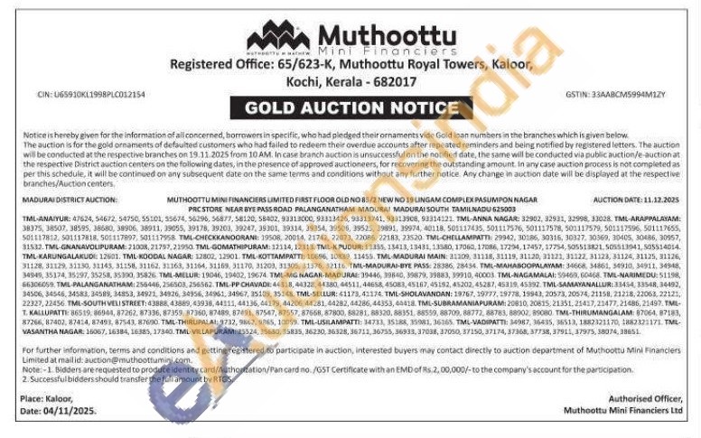 Muthoottu Mini Financiers Limited Gold Auctions Auction in Madurai