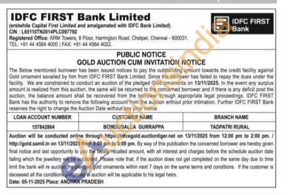 IDFC First Bank Ltd Gold Auctions Auction in Anantapur