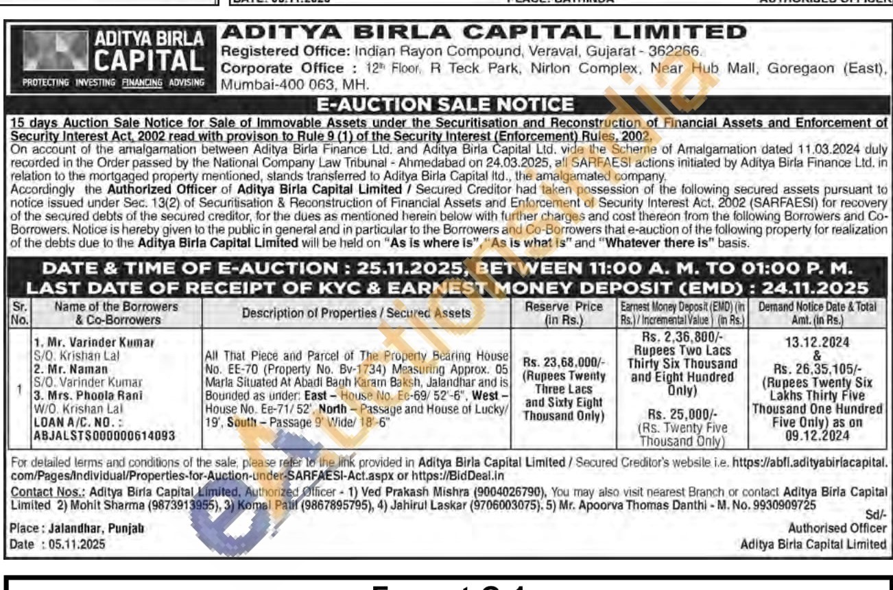 All That Piece and Parcel of The Property Bearing House No. EE-70 (Property No. Bv-1734) Measuring Approx. 05 Marla Situated At Abadi Bagh Karan Baksh, Jalandhar and is Bounded as under: East House No. Ee-69/52-6", West-House No. Ee-71/52, North - Passage and House of Lucky 19', South-Passage 9 Wide/ 18-6"