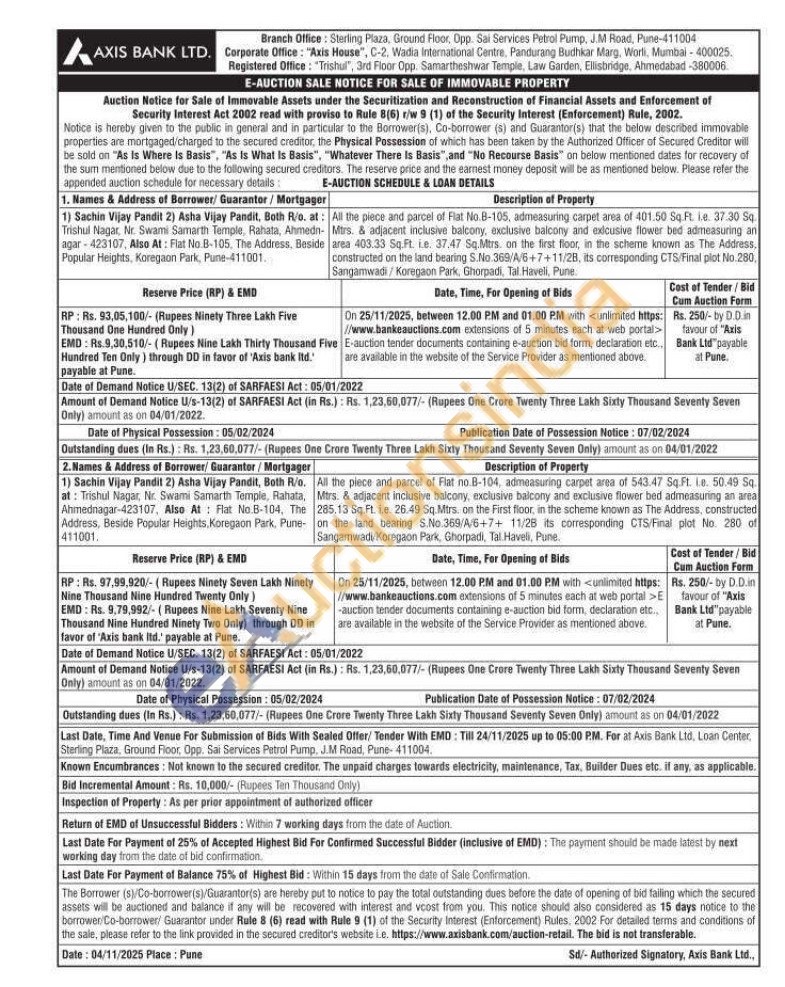 All the piece and parcel of Flat No.8-105, admeasuring carpet area of 401.50 Sq Ft. ie. 37.30 Sq. Mtrs. & adjacent inclusive balcony, exclusive balcony and exlcusive flower bed admeasuring an area 403.33 Sq.Ft. ie. 37.47 Sq.Mtrs. on the first floor, in the scheme known as The Address, constructed on the land bearing S.No.369/A/6+7+11/28, its corresponding CTS/Final plot No. 280, Sangamwadi/Koregaon Park, Ghorpadi, Tai Haveli, Pune.