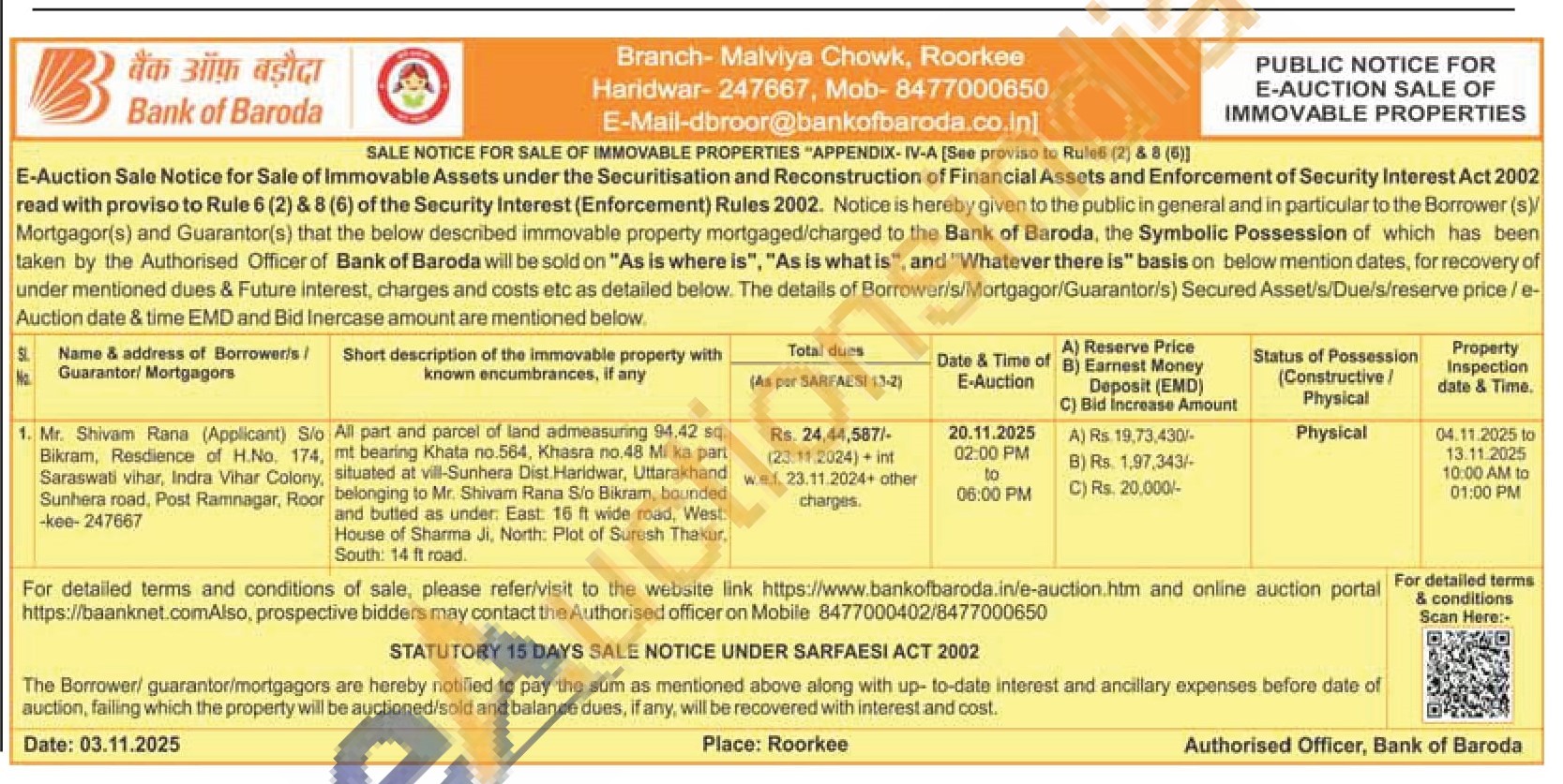 All part and parcel of land admeasuring 94.42 sq. , mt bearing Khata no.564, Khasra no.48 Mi ka part , situated at vill-Sunhera Dist. Haridwar, Uttarakhand belonging to Mr. Shivam Rana Sio Bikram, bounded and butted as under: East: 16 ft wide road, West House of Sharma Ji, North: Plot of Suresh Thakur, South: 14 ft road