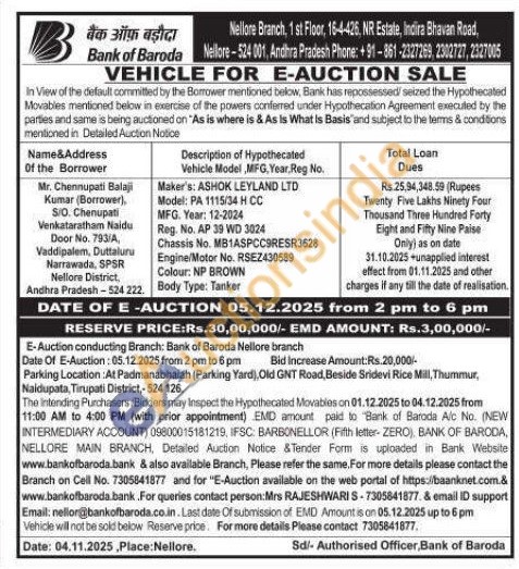 Maker's: ASHOK LEYLAND LTD Model: PA 1115/34 H CC MFG. Year: 12-2024 Reg. No. AP 39 WD 3024 Chassis No. MB1ASPCC9RESR3628 Engine/Motor No. RSEZ430589 Colour: NP BROWN Body Type: Tanker