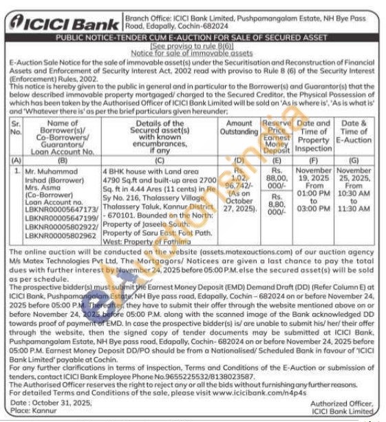 4 BHK house with Land orea 4790 Sq.ft and built-up area 2700 Sq. ft in 4.44 Ares (11 cents) in Re Sy No. 216, Thalassery Village, Thalassery Taluk, Konnur District 670101. Bounded on the North: Property of Jaseela South Property of Saru East: Foot Path. West: Property of Fathima