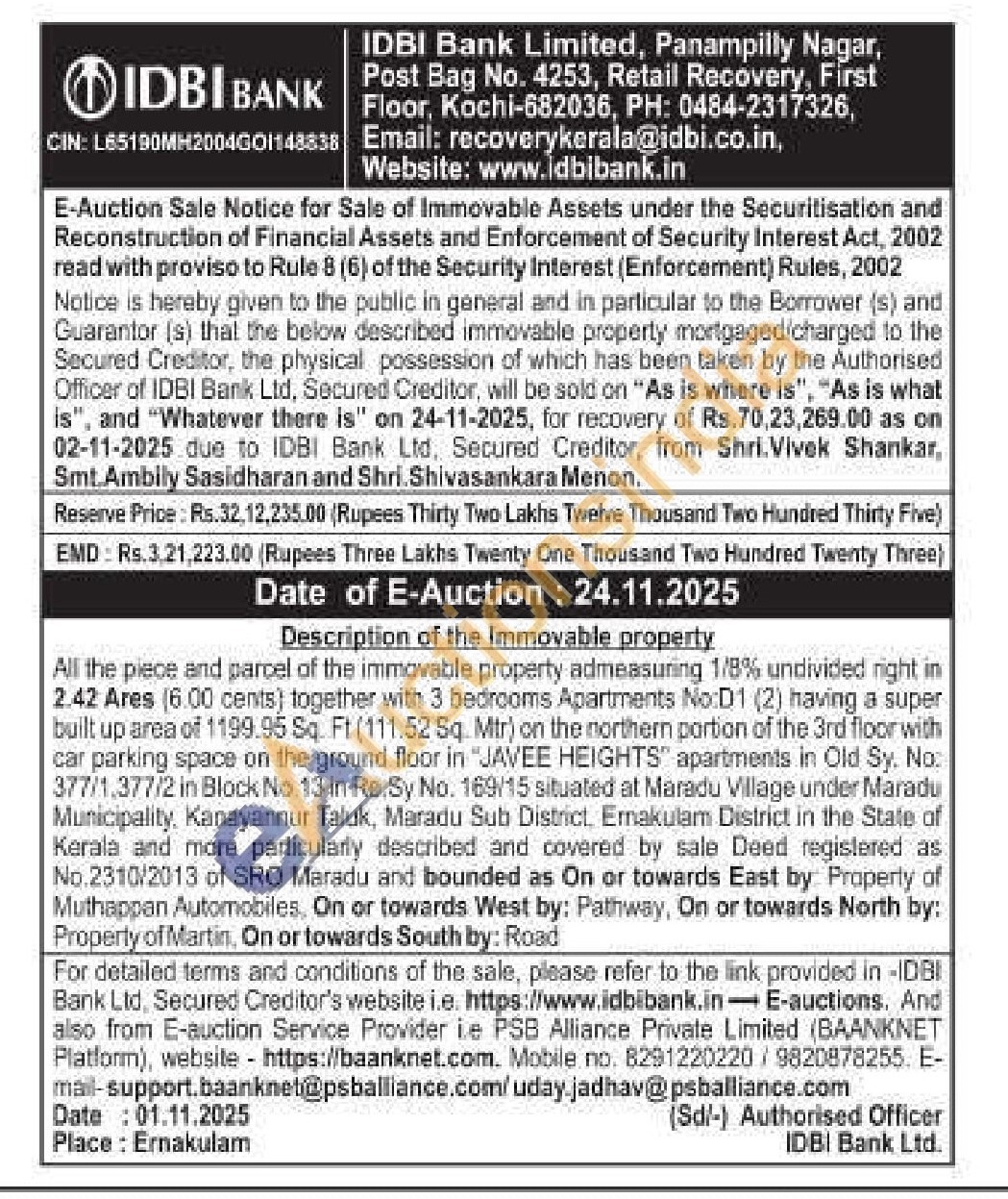 All the piece and parcel of the immovable property admeasuring 1/8% undivided right in 2.42 Ares (6.00 cents) together with 3 bedrooms Apartments No:D1 (2) having a super built up area of 1199.95 Sq. Ft (111.52 Sq. Mtr) on the northern portion of the 3rd floor with car parking space on the ground floor in "JAVEE HEIGHTS" apartments in Old Sy. No: 377/1,377/2 in Block No. 13 in Re. Sy No. 169/15 situated at Maradu Village under Maradu Municipality, Kanayannur Taluk, Maradu Sub District, Ernakulam District in the State of Kerala and more particularly described and covered by sale Deed registered as No.2310/2013 of SRO Maradu and bounded as On or towards East by Property of Muthappan Automobiles, On or towards West by: Pathway, On or towards North by: Properly of Martin, On or towards South by: Road