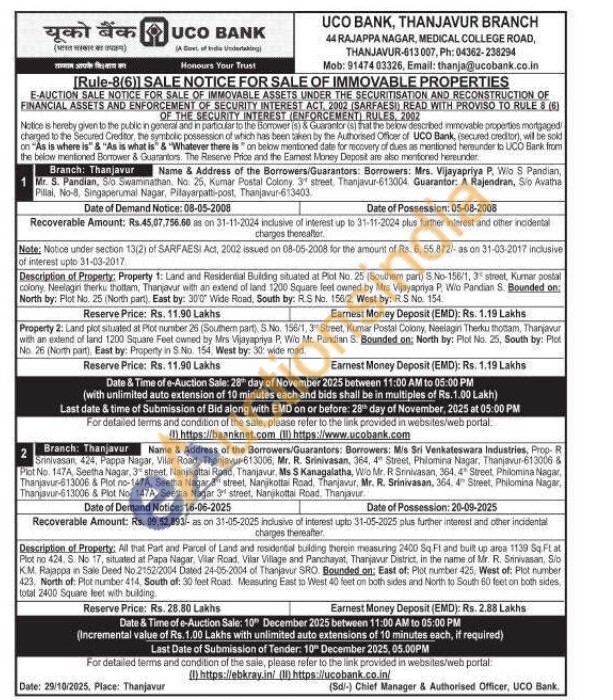 Description of Property: Property 1: Land and Residential Building situated at Plot No. 25 (Southem part) S.No-156/1, 3 stront, Kurmar postal colony. Neelagin therku thottam, Thanjavur with an extend of land 1200 Square feet owned by Mrs Vijayapriya P. Wio Pandian S. Bounded on: North by: Plot No. 25 (North part), East by: 300 Wide Road, South by: RS No. 156/2, West by: RS No. 154