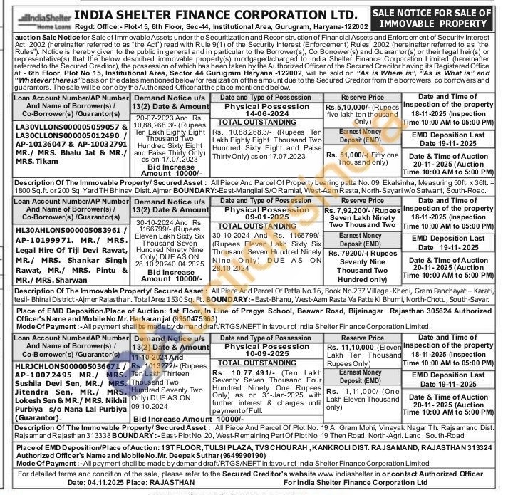 Description Of The Immovable Property/ Secured Asset: All Piece And Parcel Of Patta No.16, Book No.237 Village-Khedi, Gram Panchayat - Karati, tesil-Bhinai District-Ajmer Rajasthan. Total Area 1530 Sq. Ft. BOUNDARY:-East-Bhanu, West-Aam Rasta Va Patte Ki Bhumi, North-Chotu, South-Sayar.