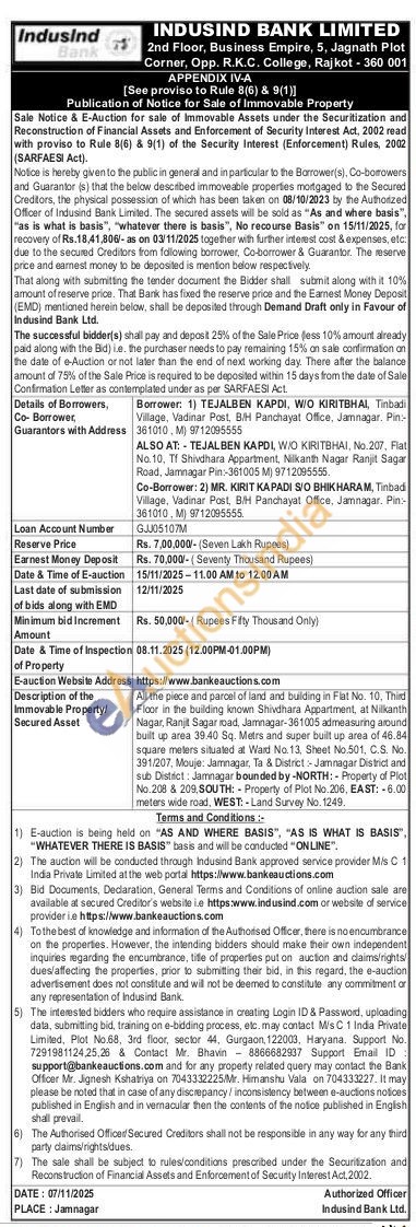 All the piece and parcel of land and buiding in Fiat No. 10, Third Floor in the building inown Shivdhara Appartment, at Nilkanth Nagar, Ranjit Sagar bad, Jamnagar-361005 admeasuring around built up area 3940 Sq. Matrs and super built up area of 46.84 square meters situated at Ward No. 13 Sheet No 501, C.S. No. 391/207. Mouje: Jamnagar, Ta & District Jamnagar District and sub District: Jamnagar bounded by -NORTH:-Property of Plot No.208 & 209, SOUTH: Property of Plot No 206, EAST: -6.00 meters wide road, WEST:-Land Survey No. 1249.