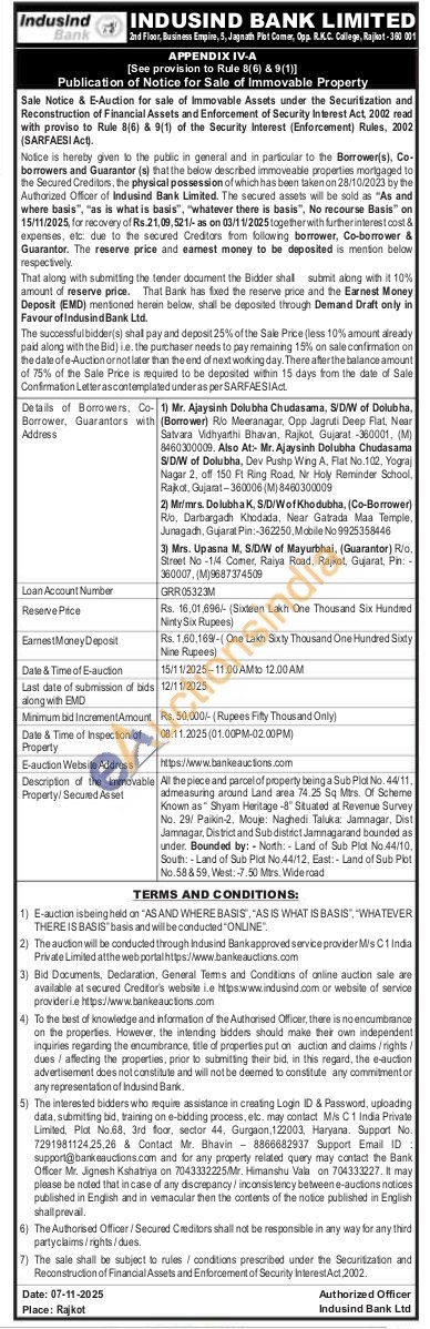 All the piece and parcel of property being a Sub Plot No. 44/11, admeasuring around Land area 74.25 54 Mtrs. Of Scheme Known as Shyam Heritage-8" Situated at Revenue Survey No. 29/ Paikin-2, Mouje: Naghedi Taluka Jamnagar, Dist Jamnagar, District and Sub distéct Jamnagarand bounded as under. Bounded by:-North: Land of Suti Plot No 44/10 South: Lind of Sub Plot No 44/12, East-Land of Sub Pet No.58859, West 7.50 Mirs Wide road