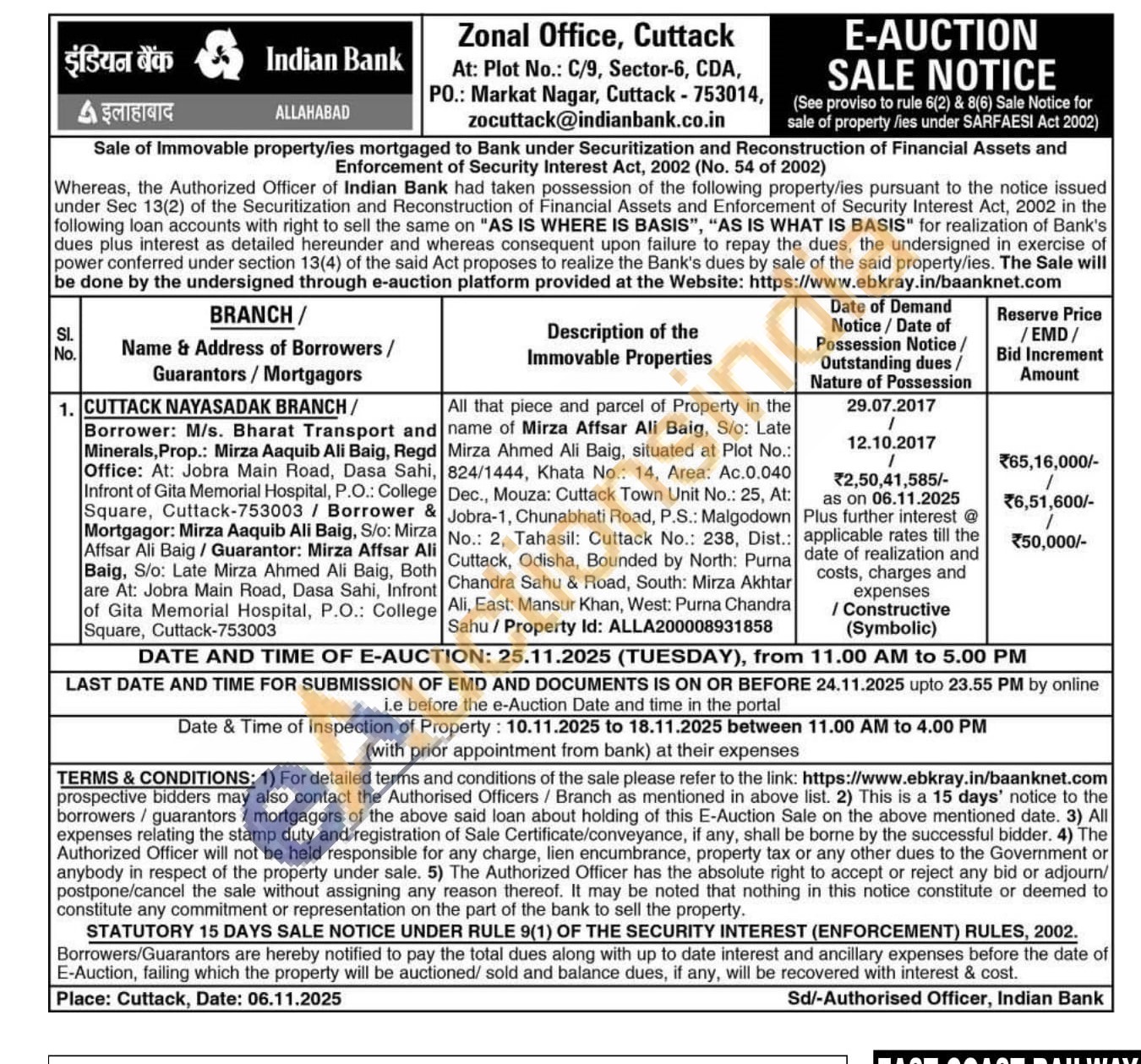All that piece and parcel of Property in the name of Mirza Affsar Ali Baig, S/o: Late Mirza Ahmed Ali Baig, situated at Plot No.: 824/1444, Khata No.: 14, Area: Ac.0.040 Dec., Mouza: Cuttack Town Unit No.: 25, At: Jobra-1, Chunabhati Road, P.S.: Malgodown No.: 2, Tahasil: Cuttack No.: 238, Dist.: Cuttack, Odisha, Bounded by North: Purna Chandra Sahu & Road, South: Mirza Akhtar Ali, East: Mansur Khan, West: Purna Chandra Sahu / Property Id: ALLA200008931858