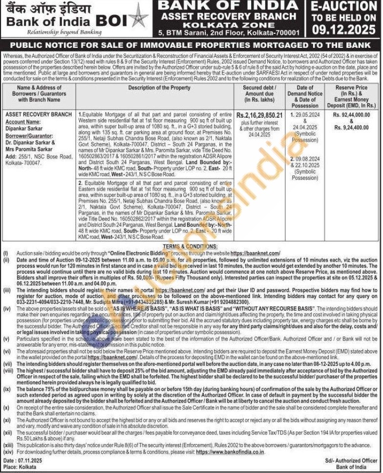 Equitable Mortgage of all that part and parcel consisting of entire Westem side residential flat at 1st floor measuring 900 sq ft of built up area, within super built-up area of 1080 sq. ft., in a G+3 storied building. along with 135 sq. ft. car parking area at ground floor, at Premises No. 255/1, Netaji Subhas Chandra Bose Road, (also known as 2/1, Naktala Govt Scheme), Kolkata-700047, District South 24 Parganas, in the names of Mr Dipankar Sarkar & Mrs. Paromita Sarkar, vide Title Deed No. 160502863/2017 & 160502861/2017 within the registration ADSR Alipore and District South 24 Parganas, West Bengal. Land Bounded by:-North-48 ft wide KMC road, South-Property under LOP no. 2. East- 20 ft wide KMC road, West-243/1, NSC Bose Road. Equitable Mortgage of all that part and parcel consisting of entire Eastern side residential flat at 1st floor measuring 900 sq ft of built up area, within super built-up area of 1080 sq. ft., in a G+3 storied building, at Premises No. 255/1, Netaji Subhas Chandra Bose Road, (also known as 2/1, Naktala Govt Scheme), Kolkata-700047, District South 24 Parganas, in the names of Mr Dipankar Sarkar & Mrs. Paromita Sarkar, vide Title Deed No. 160502862/2017 within the registration ADSR Alipore and District South 24 Parganas, West Bengal. Land Bounded by:-North-48 ft wide KMC road, South- Property under LOP no. 2. East 20 ft wide KMC road, West-243/1, NSC Bose Road.