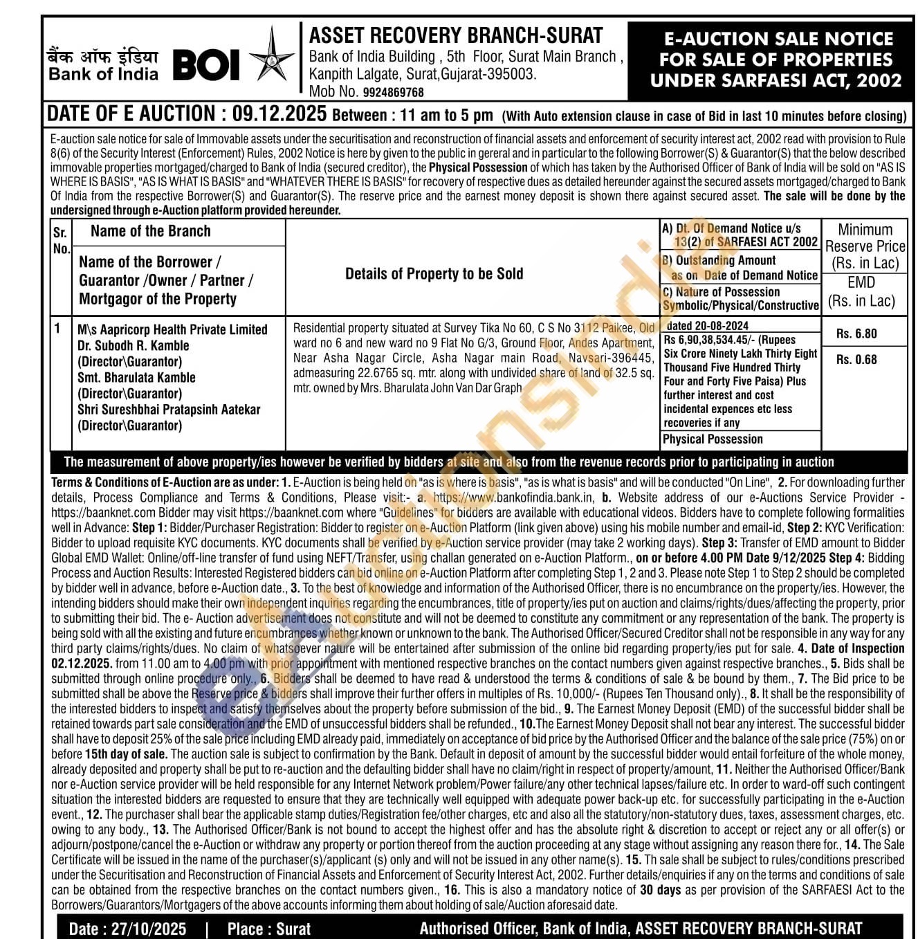 Residential property situated at Survey Tika No 60, C S No 3112 Paikee, Old ward no 6 and new ward no 9 Flat No G/3, Ground Floor, Andes Apartment, Near Asha Nagar Circle, Asha Nagar main Road, Navsari-396445, admeasuring 22.6765 sq. mtr. along with undivided share of land of 32.5 sq. mtr. owned by Mrs. Bharulata John Van Dar Graph
