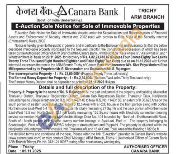 All part and parcel of the property and building situated at Thanjavur District, Thanjavur Registration District, Vallam Sub Registration District, Thanjavur Taluk, Nanjikottai Vallundampattu Village in natham Old R.S. No. 114E/14B to New R.S. No. 114E/158, an extent of 0.06.625 Ares on the south portion of eastern side out of total extent 0.12.5 Ares with a RCC house in the front portion along with portico Northem side East-West 5.4 mtr, North-South 5 mtr totally measuring 27 Sq.mtr and the back portion of Northern side East-West 12.5 mtr, North-South 12.4 mtr totally measuring 155 Sq.mtr house with Electricity connection bearing service connection No. 504, along with electric fittings Door No. 404 bounded by North of Enathukanpatti Road, South of North portion in the same survey number belongs to Ayadurai, East of The property belonging to Soundarajan, West of: R.S.No. 14E/8C belongs to Arunachalam and Pappathi. The property is situated within the Nanjikottai Vallundampattu Panchayat Limit. Total Area of Land 15.44 Cent. Total Area of the Building 1782 Sq.ft
