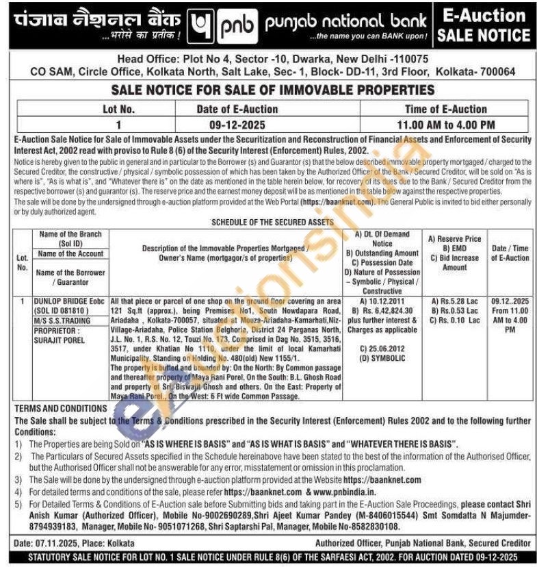 All that piece or parcel of one shop on the ground floor covering an area 121 Sq.ft (approx.), being Premises No1, South Nowdapara Road, Ariadaha, Kolkata-700057, situated at Mouza-Ariadaha-Kamarhati, Niz-Village-Ariadaha, Police Station Belghoria, District 24 Parganas North, J.L. No. 1, R.S. No. 12, Touzi No. 173, Comprised in Dag No. 3515, 3516, 3517, under Khatian No 1110, under the limit of local Kamarhati Municipality, Standing on Holding No. 480(old) New 1155/1.The property is butted and bounded by: On the North: By Common passage and thereafter property of Maya Rani Porel, On the South: B.L. Ghosh Road and property of Sri. Biswajit Ghosh and others. On the East: Property of Maya Rani Porel., On the West: 5 Ft wide Common Passage.