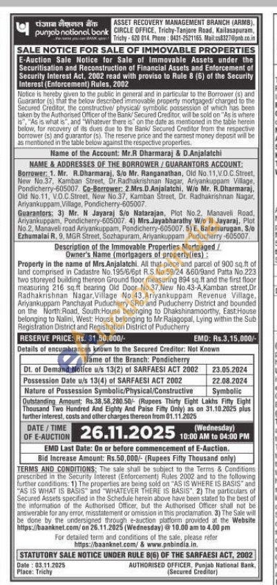 All that piece and parcel of 900 sq.ft of land comprised in Cadastre No. 195/6/6pt R.S.No.59/24 &60/9and Patta No.223 two storeyed building thereon Ground floor measuring 894 sq.ft and the first floor measuring 216 sq.ft bearing Old Door No.37, New No.43-A, Kamban street, Dr Radhakrishnan Nagar, Village No. 43. Ariyankuppam Revenue Village, Ariyankuppam Panchayat Puducherry SRO and Puducherry District and bounded on the North Road, South House belonging to Dhakshinamoorthy, East House belonging to Nalini, West: House belonging to Mr. Rajagopal, Lying within the Sub Registration District and Registration District of Puducherry