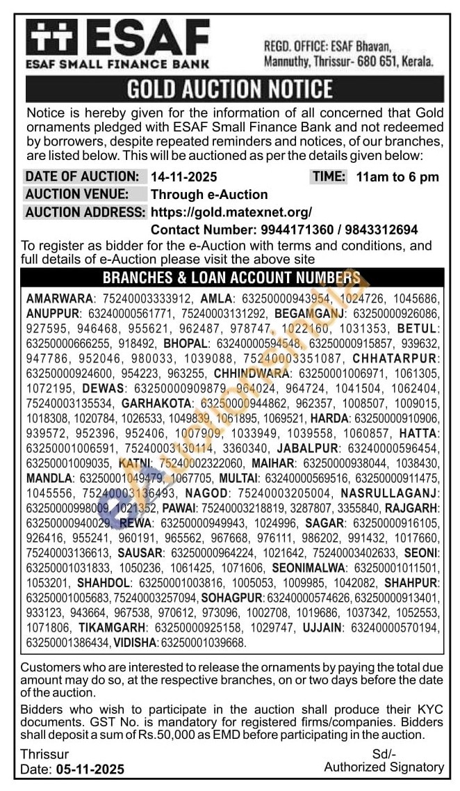 ESAF SMALL FINANCE BANK Gold Auctions Auction in Thrissur