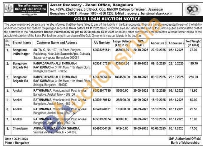 Bank of Maharashtra Gold Auctions Auction in Bengaluru