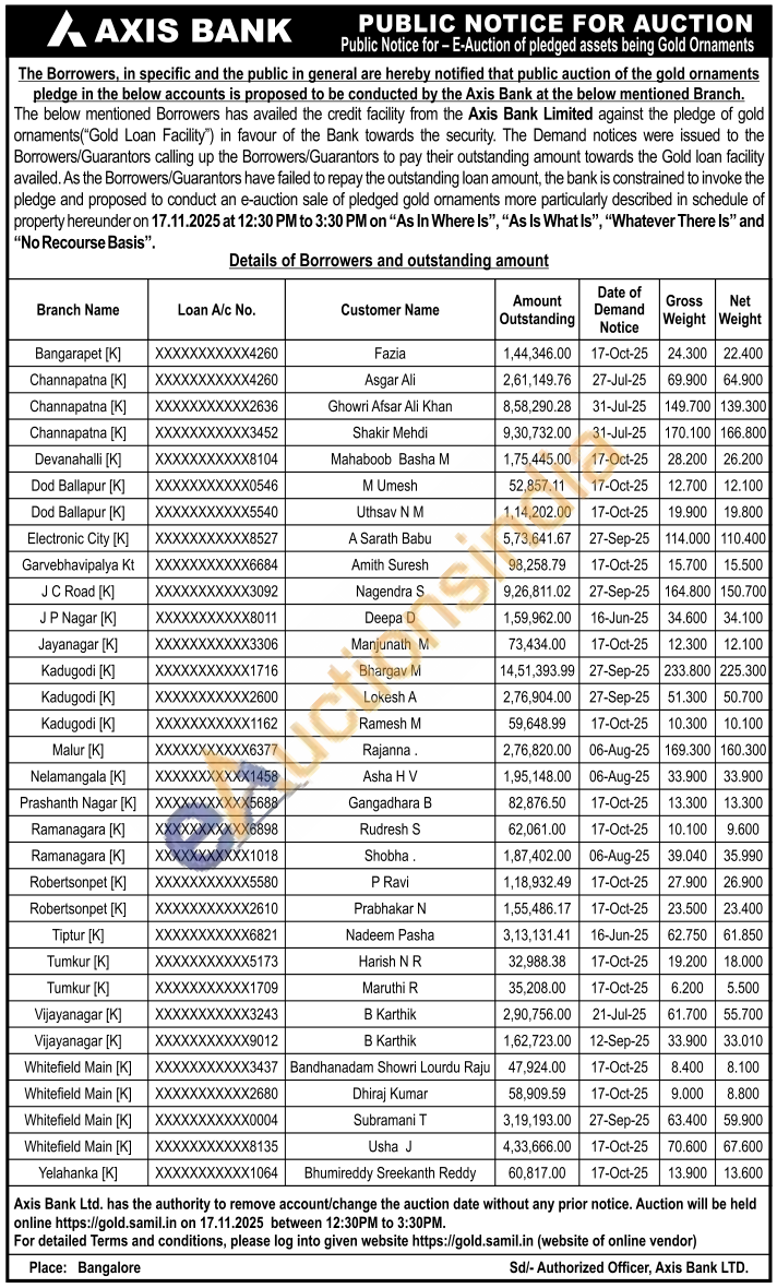 Axis Bank Gold Auctions Auction in Vijayanagar