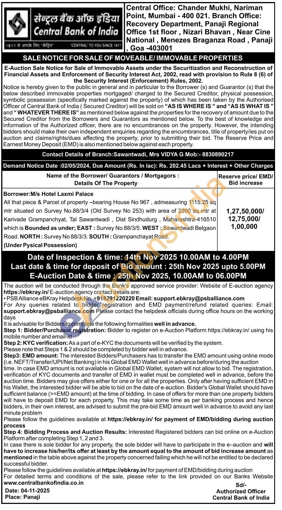 All that piece & Parcel of property-bearing House No 967, admeasuring 1115.25 sq mtr situated on Survey No.88/3/4 (Old Survey No 253) with area of 2200 sq mtr at Karivade Grampanchyat, Tal Sawantwadi, Dist Sindhudurg, Maharashtra-416510 which is Bounded as under; EAST: Survey No 88/3/5 WEST: Sawantwadi Belgaon Road, NORTH: Survey No 88/3/3. SOUTH: Grampanchayat Road