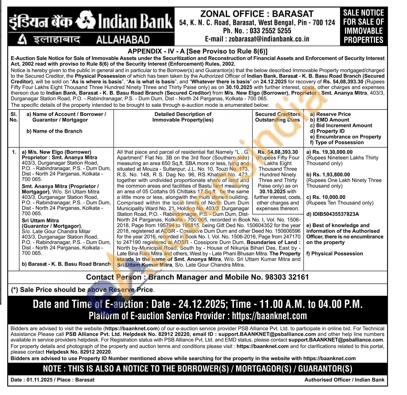 that piece and parcel of residential flat Namely "L. G. Apartment Flat No. 3B on the 3rd floor (Southern side) measuring an area 650 Sq.ft. SBA more or less, lying and situated at Mouza - Sultanpur, J.L. No. 10, Touzi No. 173, R.S. No. 148, R S. Dag No. 96, RS Khatian No. 473, together with undivided proportionate share of land and the common areas and facilities of Bastu land measuring an area of 05 Cottahs 05 Chittaks 17 Sq.ft. be the same a little more or less, alongwith the multi storied building. Comprised within the local limits of North Dum Dum Municipality Ward No. 21, Holding No. 403/3, Durganagar Station Road, P.O. - Rabindranagar, P.S. - Dum Dum, Dist-North 24 Parganas, Kolkata - 700 065, recorded in Book No. I, Vol. No. 1506-2018, Page from 195794 to 195815, being Gift Ded No. 150604352 for the year 2018, registered at ADSR - Cossipore Dum Dum and other Deed No. 150606596 for the year 2016, recorded in Book No. I, Vol. No. 1506-2016, Page from 247170 to 247190 registered at ADSR Cossipore Dum Dum. Boundaries of Land: North by-Municipal Road, South by House of Nikunja Bihari Das, East by -Late Bina Rani Mitra and others, West by - Late Phani Bhusan Mitra. The Property stands in the name of Smt. Anonya Mitra, W/o. Sri Uttam Kumar Mitra and Sri Uttam Kumar Mitra. S/o. Late Gour Chandra Mitra.