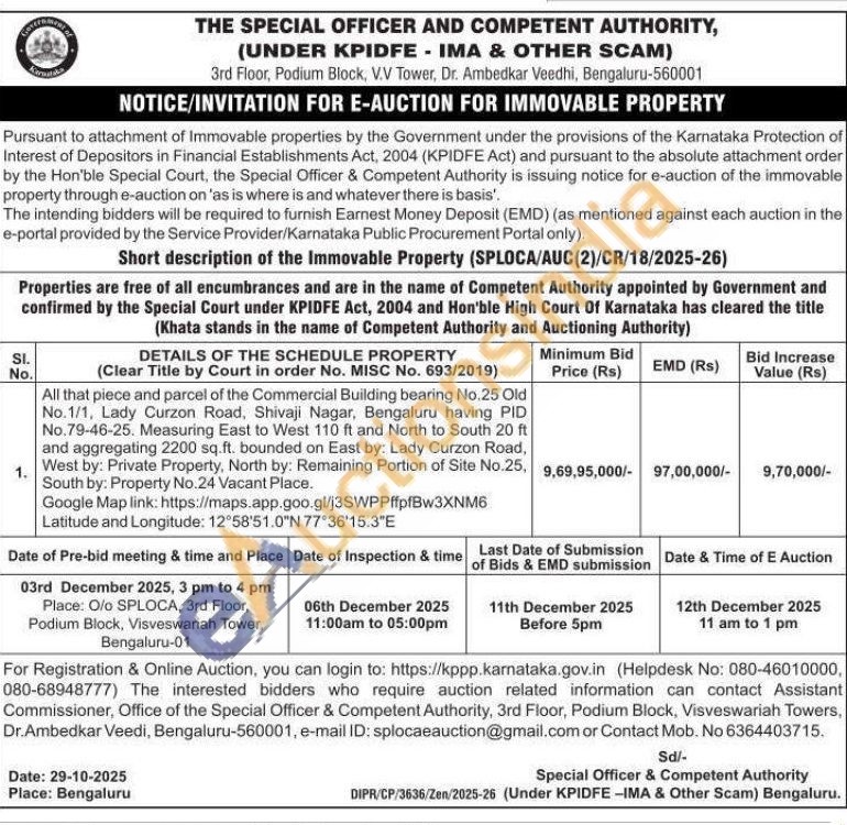 All that piece and parcel of the Commercial Building bearing No.25 Old No.1/1, Lady Curzon Road, Shivaji Nagar, Bengaluru having PID No.79-46-25. Measuring East to West 110 ft and North to South 20 ft and aggregating 2200 sq.ft. bounded on East by: Lady Curzon Road, West by: Private Property, North by: Remaining Portion of Site No.25. South by: Property No.24 Vacant Place.