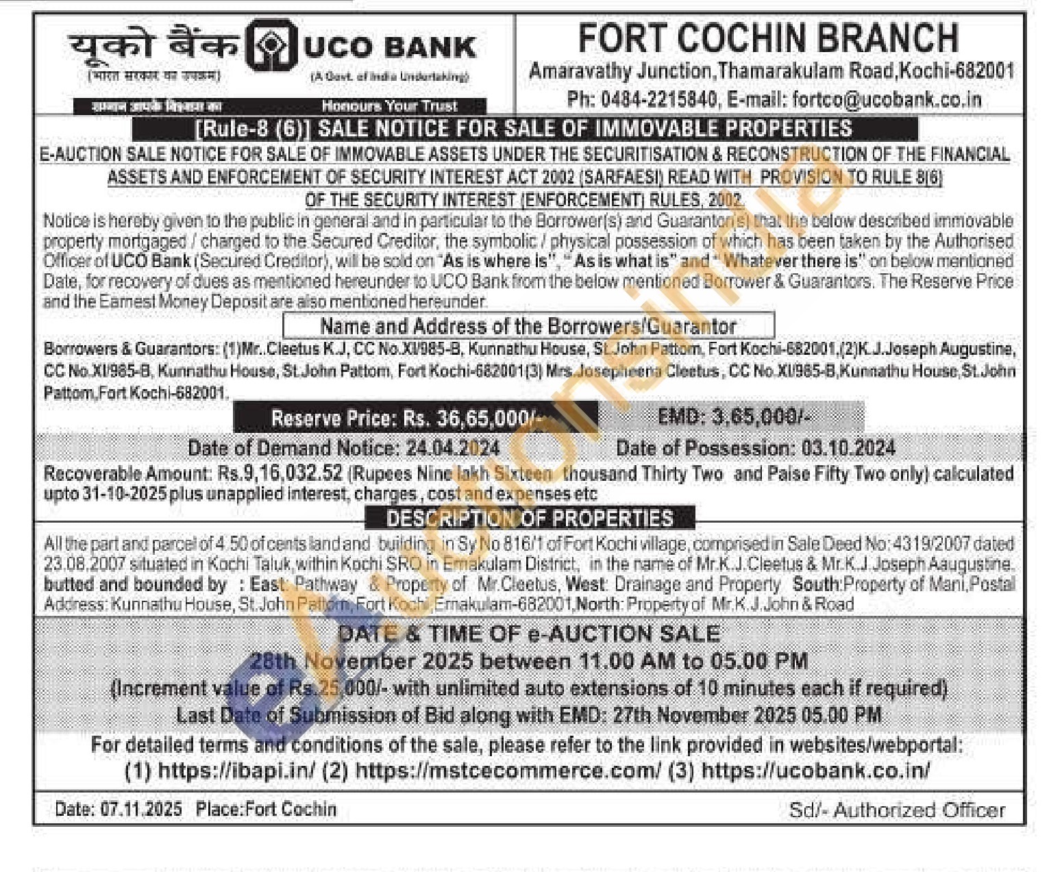All the part and parcel of 4.50 of cents landand building in Sy No 816/1 of Fort Kochi village, comprised in Sale Deed No: 4319/2007 dated 23.08.2007 situated in Kochi Taluk, within Kochi SRO in Emakulam District, in the name of Mr.K.J.Cleetus & Mr.K.J. Joseph Aaugustine. butted and bounded by: East: Pathway & Property of Mr.Cleetus, West: Drainage and Property South Property of Mani, Postal Address: Kunnathu House, St. John Patton, Fort Kochi, Ernakulam-682001, North: Property of Mr.K.J.John & Road