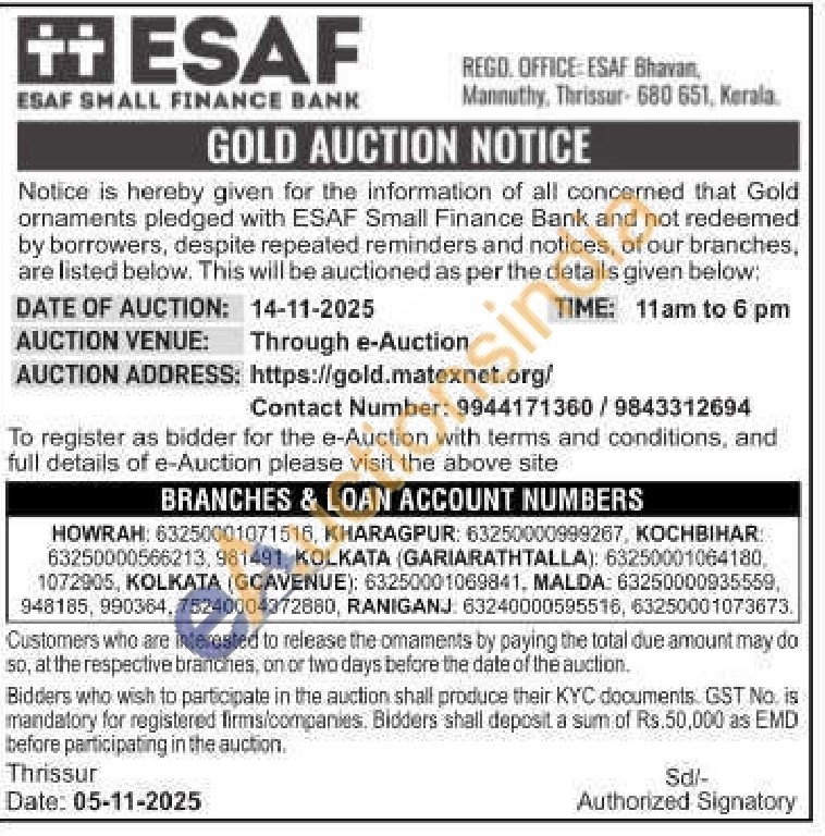 ESAF SMALL FINANCE BANK Gold Auctions Auction in Thrissur