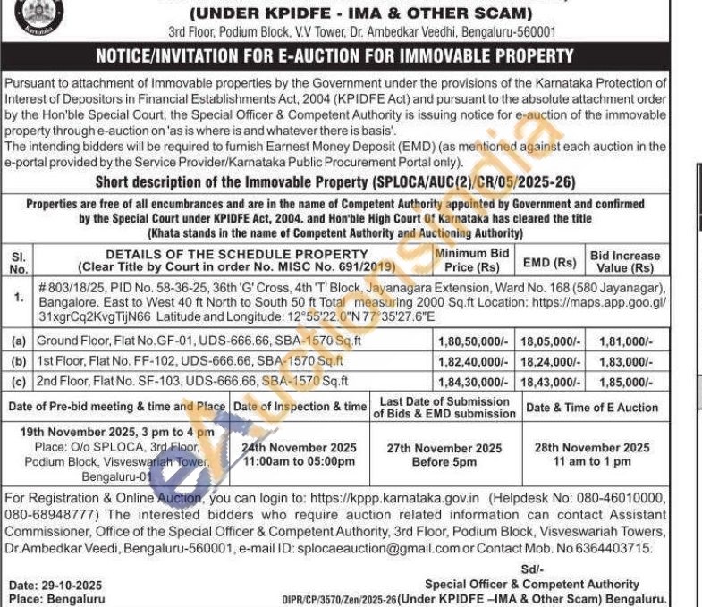 #803/18/25, PID No. 58-36-25, 36th 'G' Cross, 4th 'T' Block, Jayanagara Extension, Ward No. 168 (580 Jayanagar), Bangalore. East to West 40 ft North to South 50 ft Total measuring 2000 Sq.ft Location: https://maps.app.goo.gl/31xgrCq2KvgTijN66 Latitude and Longitude: 12°55'22.0″N 77°35′27.6"E 1) Ground Floor, Flat No. GF-01, UDS-666,66, SBA-1570 Sq.ft