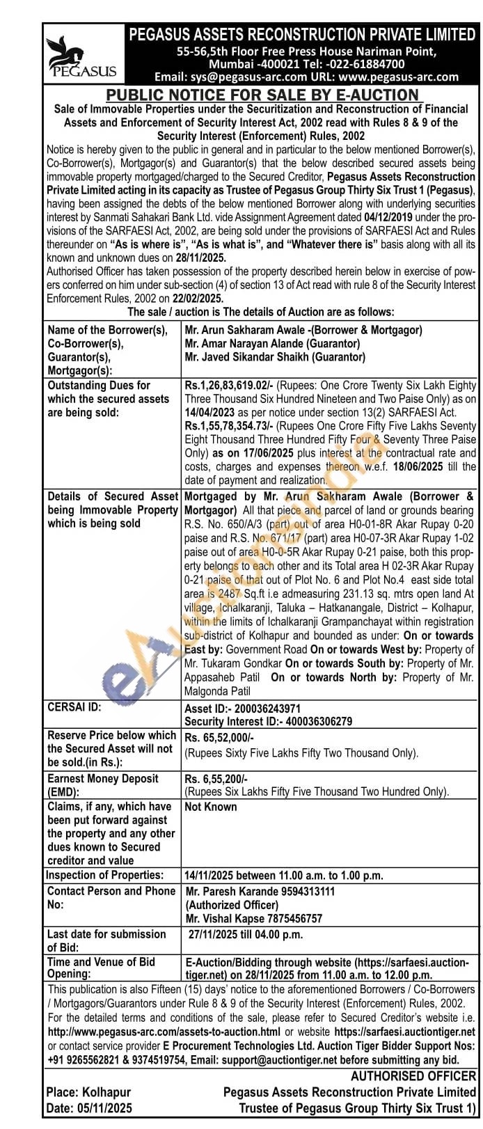 All that piece and parcel of land or grounds bearing R.S. No. 650/A/3 (part) out of area H0-01-8R Akar Rupay 0-20 paise and R.S. No. 671/17 (part) area H0-07-3R Akar Rupay 1-02 paise out of area H0-0-5R Akar Rupay 0-21 paise, both this prop-erty belongs to each other and its Total area H 02-3R Akar Rupay 0-21 paise of that out of Plot No. 6 and Plot No.4 east side total area is 2487 Sq.ft ie admeasuring 231.13 sq. mtrs open land At village, Ichalkaranji, Taluka Hatkanangale, District Kolhapur, within the limits of Ichalkaranji Grampanchayat within registration sub-district of Kolhapur and bounded as under. On or towards East by: Government Road On or towards West by: Property of Mr. Tukaram Gondkar On or towards South by: Property of Mr. Appasaheb Patil On or towards North by: Property of Mr. Malgonda Patil