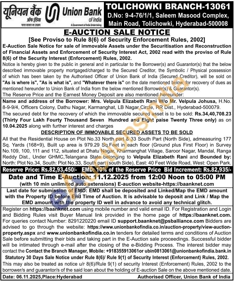 DESCRIPTION OF IMMOVABLE SECURED ASSETS TO BE SOLD : All that the Residential House on Plot No.33 North part & 33 South Part (North Side), admeasuring 177 Sq. Yards (168+9), Built up area is 979.29 Sq. Feet in each floor (Ground plus First Floor) in Survey No. 109, 100, 111 and 112, situated at Dhatu Nagar, Kharmanghat Village, Saroor Nagar, Mandal, Ranga Reddy Dist., Under GHMC, Telangana State belonging to Velpula Elizabeth Rani and Bounded by: North: Plot No.34, South: Plot No.33, South part (south Side), East: 40 Feet Wide Road, West: Open Park