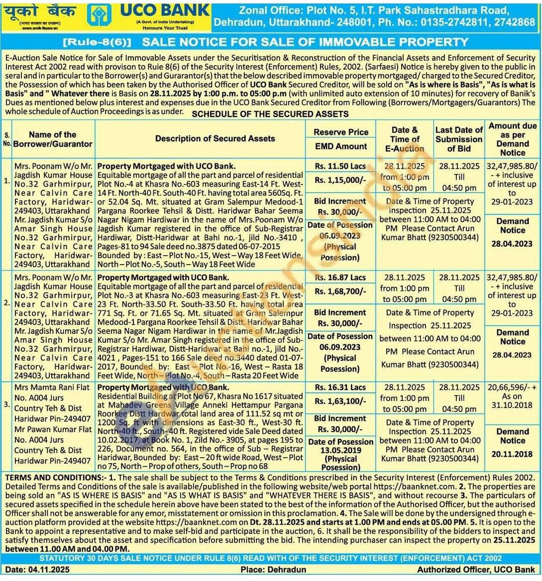 Property Mortgaged with UCO Bank : Residential Building at Plot No 67, Khasra No 1617 situated at Mahadev Greens Village Anneki Hettampur Pargana Roorkee Distt Hardwar total land area of 111.52 sq mt or 1200 Sq. ft with dimensions as East-30 ft., West-30 ft. North-40 ft., South-40 ft. Registered vide Sale Deed dated 10.02.2017, at Book No. 1, Zild No.- 3905, at pages 195 to 226, Document no. 564, in the office of Sub - Registrar Haridwar, Bounded by: East-20 ft wide Road, West-Plot no 75, North-Prop of others, South-Prop no 68