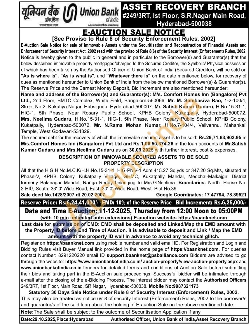 All that the HIG H.No.M.C.K/H.H.No. 15-31-1, HIG-Ph V-1 Adm 415.27 Sq.yds or 347.20 Sq.Mts, situated at Phase-V, KPHB Colony, Kukatpally Village, GHMC, Kukatpally Mandal, Medchal-Malkajgiri District formerly Balanagar Mandal, Ranga Reddy belonging to Mrs.G.Neelima. Boundaries: North: House No. 2-HIG, South: 33'-0' Wide Road, East: 30'-0' Wide Road, West: Plot No.39