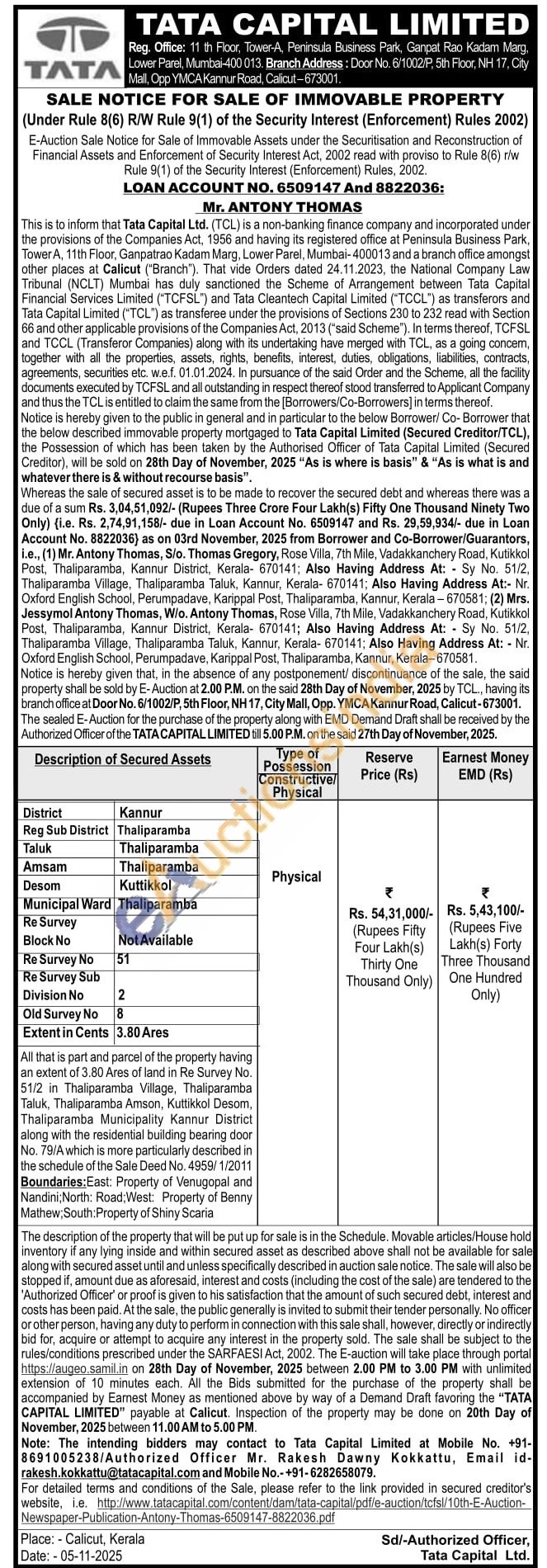 All that is part and parcel of the property having an extent of 3.80 Ares of land in Re Survey No. 51/2 in Thaliparamba Village, Thaliparamba Taluk, Thaliparamba Amson, Kuttikkol Desom, Thaliparamba Municipality Kannur District along with the residential building bearing door No. 79/A which is more particularly described in the schedule of the Sale Deed No. 4959/1/2011 Boundaries: East: Property of Venugopal and Nandini; North: Road; West: Property of Benny Mathew; South: Property of Shiny Scaria