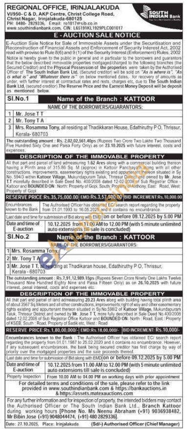 All that part and parcel of land admeasuring 1.62 Ares along with a commercial building thereon having a Plinth area of 315.86 Sq. M (approx) in Kattoor Panchayath along with all other constructions, improvements, sasementary tights existing and appurtenant thereon situated in Sy No. 594/3 within Kattoor Village, cTaluk, Thissur District and owned by Mr. Jose T.T morefully described in Sale Deed No. 400-2008 dated 12-02-2008 of Sub Registrar Office Kaltoor and BOUNDED ON: North Property of Gopi, South: Property of Anthony, East Road, West Property of Gop
